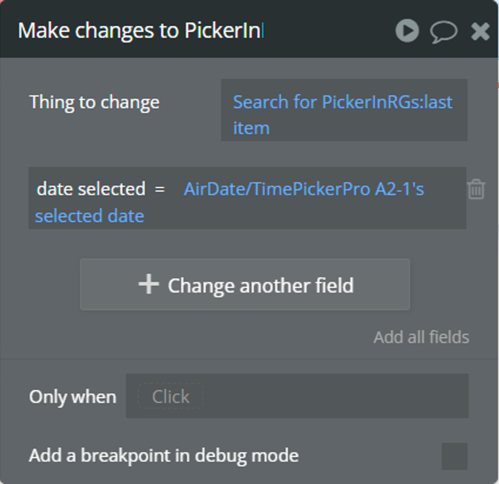 When the “value is changed” event is triggered, the selected value from the “selected date” state will be registered in the database using the “Make changes to thing...” action.