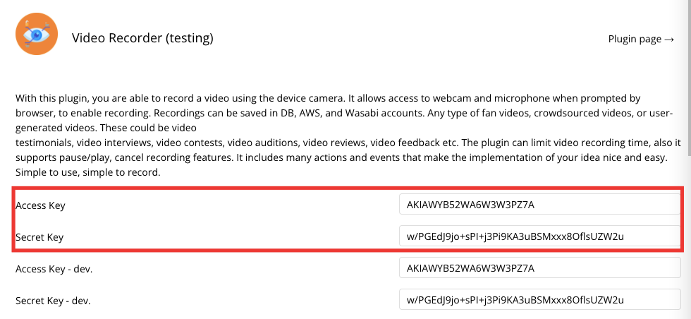 Insert the access key/secret from the plugins tab.