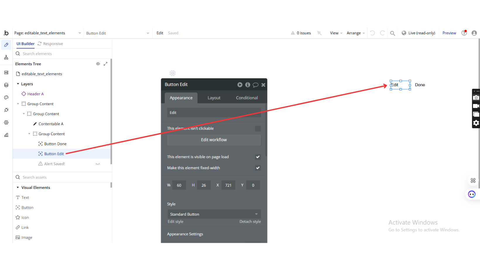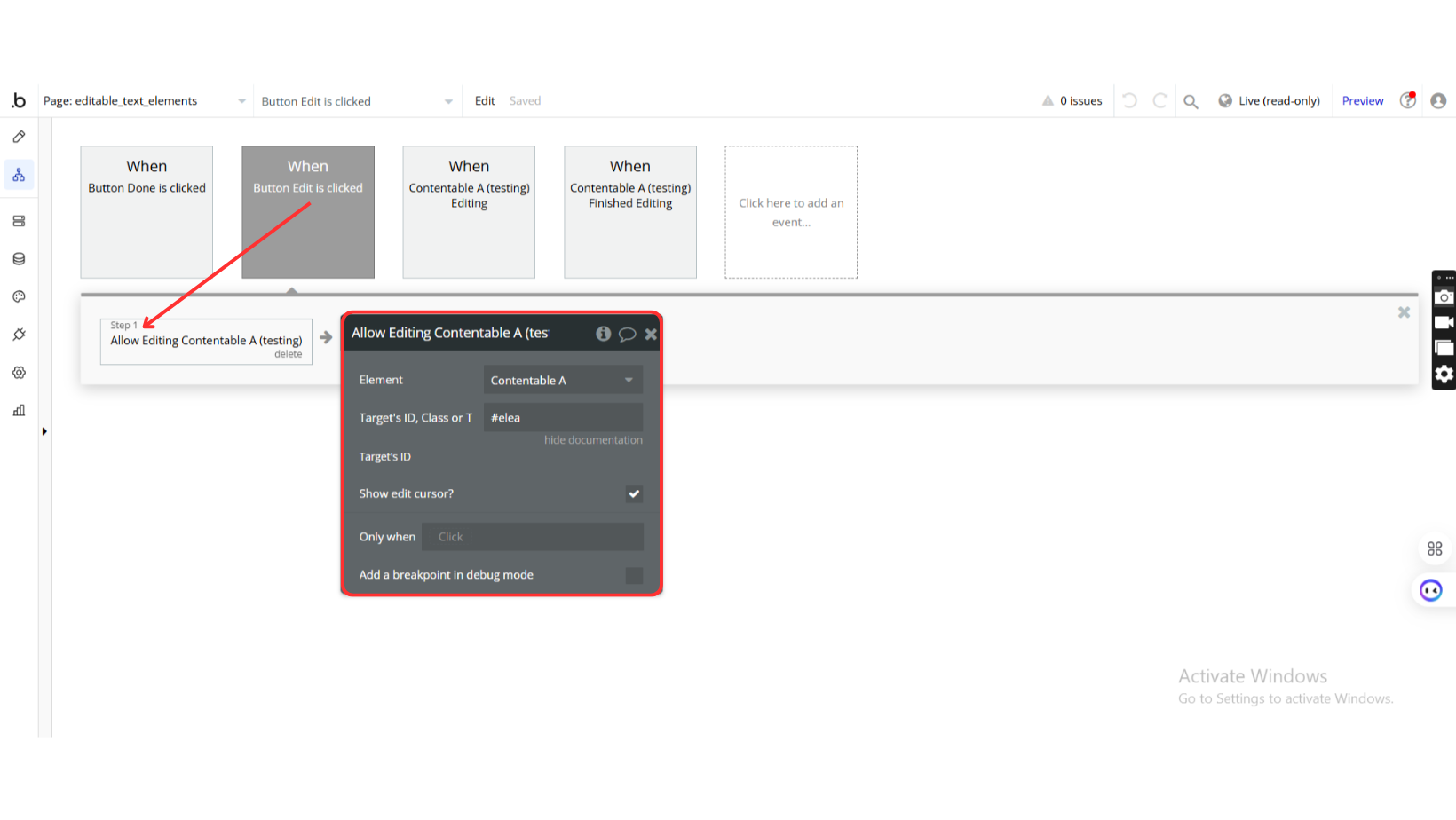 The EditableText element allows text to become editable upon triggering a workflow action.