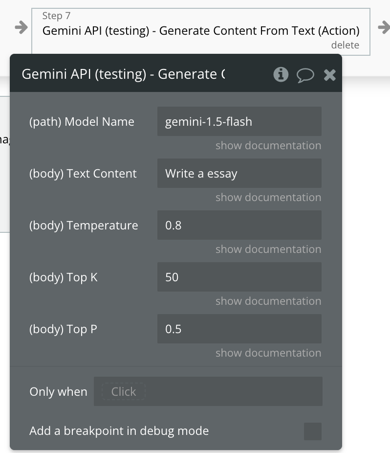 Temperature | Affects creativity and randomness in output. Lower values (e.g., 0.2) produce focused, repetitive responses; higher values (e.g., 0.8) add variation.