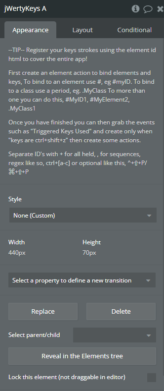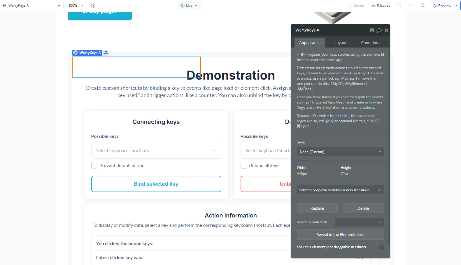 First create an element action to bind elements and keys, To bind to an element use #, eg #myID. To bind to a class use a period, eg. .MyClass To more than one you can do this, #MyID1, #MyElement2, .MyClass1. Once you have finished you can then grab the events such as “Triggered Keys Used” and create only when “keys are ctrl+shift+z” then create some actions. Separate ID’s with + for all held, , for sequences, regex like so, ctrl+[a-c] or optional like this, ⌃+⇧+P/⌘+⇧+P