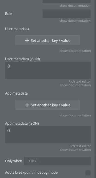 User metadata (JSON) | A custom data object to store the user’s metadata. These will be automatically merged with the User metadata field. (Stored in the raw_user_meta_data column of the auth.users table.) | Text | No |