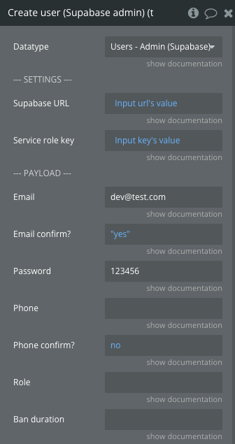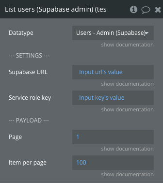 Datatype | Select “Users - Admin (Supabase)” for this field. This type is automatically defined by the Supabase plugin and allows returning the users. | Custom Type | Yes |