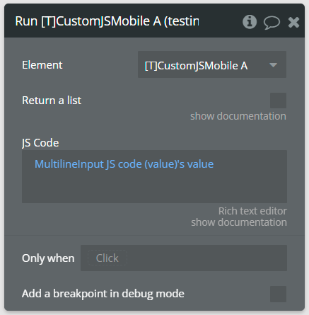 Indicates that the custom JS should return a list of values. Result will be saved in the "value as list" state. Otherwise, result will be saved in the "value" state.