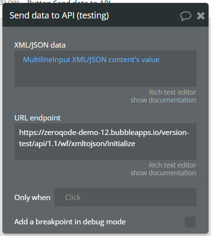 Send data to API — This action allows you to send XML or JSON data to an external API endpoint.