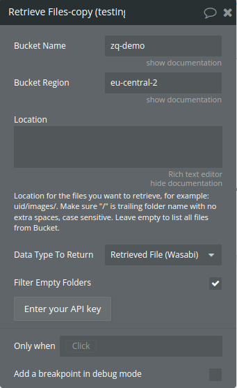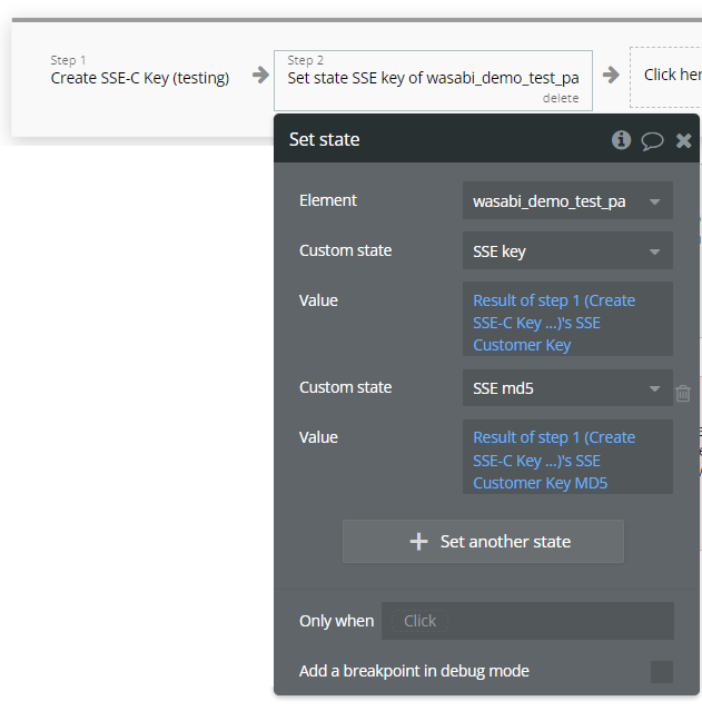 Sse_key | In order to use Wasabi server side encryption fill-in this field with 256-bit, base64-encoded encryption key. You can use “Create SSE-C Key” action to create the key. | Text |