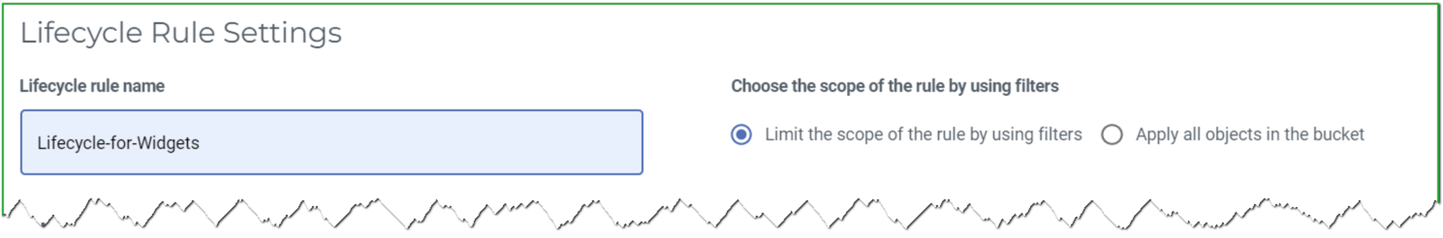 - Choose the scope of the rule. You can:— Limit the scope of the rule by using filters. Continue with Step 6.— Apply the rule to all objects in the bucket. Skip to Step 7.